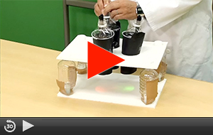 (1) ペットボトル(350ml)7本 (2) 四つ切りサイズの黒い紙と型紙1枚ずつ (3) 透明のプラスチックコップ 3個 (4) スチレンボード、B4サイズのもの 1枚 (5) LED白色ペンライト3本 (6) 食用色素、赤・青・緑の3色 各1本 (7) じょうご 1つ (8) 輪ゴム6本とカッターナイフ1本 実験に使う台紙をダウンロード »